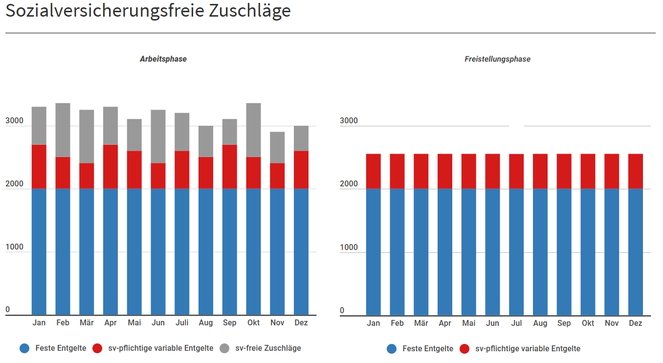 Anders als bei den sozialversicherungspflichtigen Zuschlägen, werden die sozialversicherungsfreien Zuschläge während der Freistellungsphase nicht in der durchschnittlichen Höhe der letzten 12 Monate der Arbeitsphase ausgezahlt. Zum Bedauern vieler Arbeitnehmer/*innen entfallen die Gelder komplett. Das Entgelt ist über die Freistellungsphase demnach konstant, aber geringer als in der Arbeitsphase.