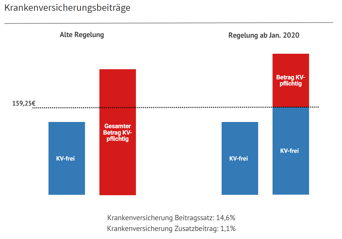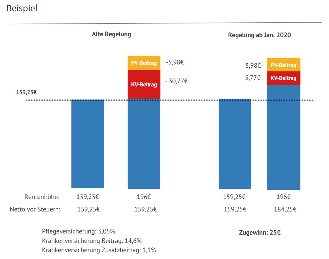 Die neuen Regelungen hingegen legen als Bemessungsgrundlage nun nicht mehr den vollen Betrag zugrunde, wenn eine Rente von über 159,25€ empfangen wird. Nur die Höhe des Betrags, der den Freibetrag von 159,25€ übersteigt, wird zukünftig von Beiträgen zur Krankenversicherung betroffen sein. Dies entlastet die  Empfängerinnen und Empfänger von Betriebsrenten.